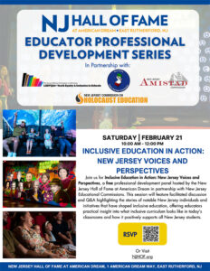 Join us for Inclusive Education in Action: New Jersey Voices and Perspectives, a free professional development panel hosted by the New Jersey Hall of Fame at American Dream in partnership with New Jersey Educational Commissions. This session will feature facilitated discussion and Q&A highlighting the stories of notable New Jersey individuals and initiatives that have shaped inclusive education, offering educators practical insight into what inclusive curriculum looks like in today’s classrooms and how it positively supports all New Jersey students.